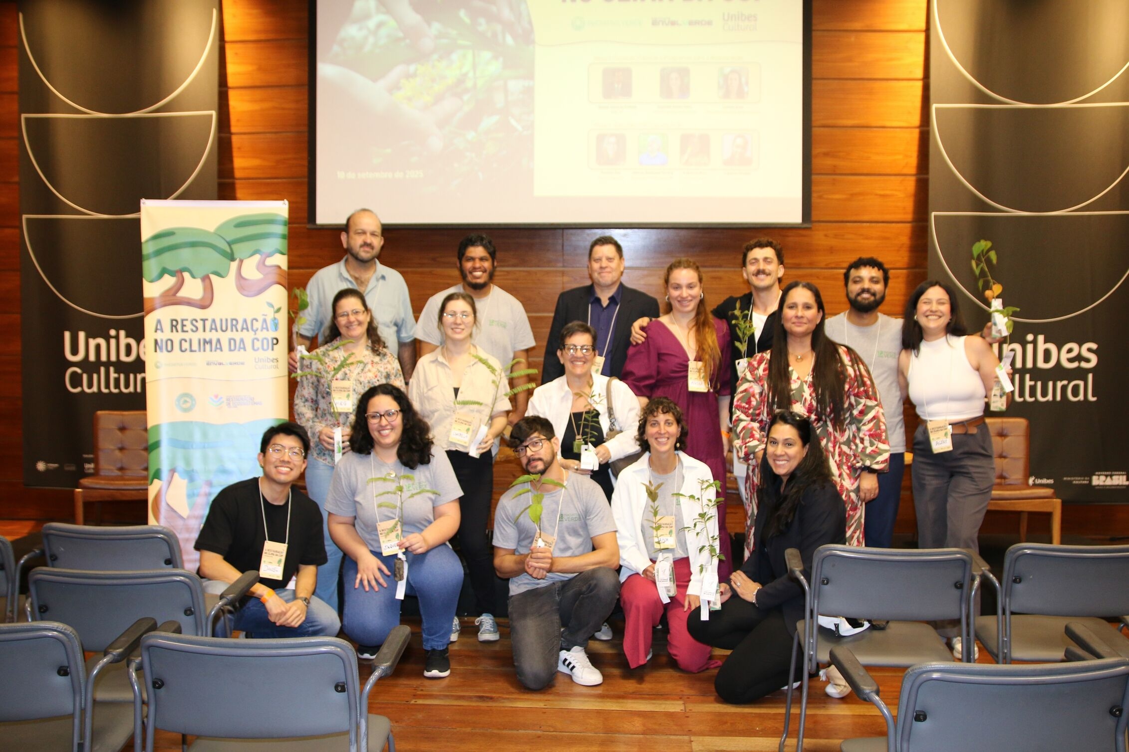 Equipe da Iniciativa Verde reunida no evento A Restaração no Clima da COP. Set. de 2025. Foto: Unibes Cultural
