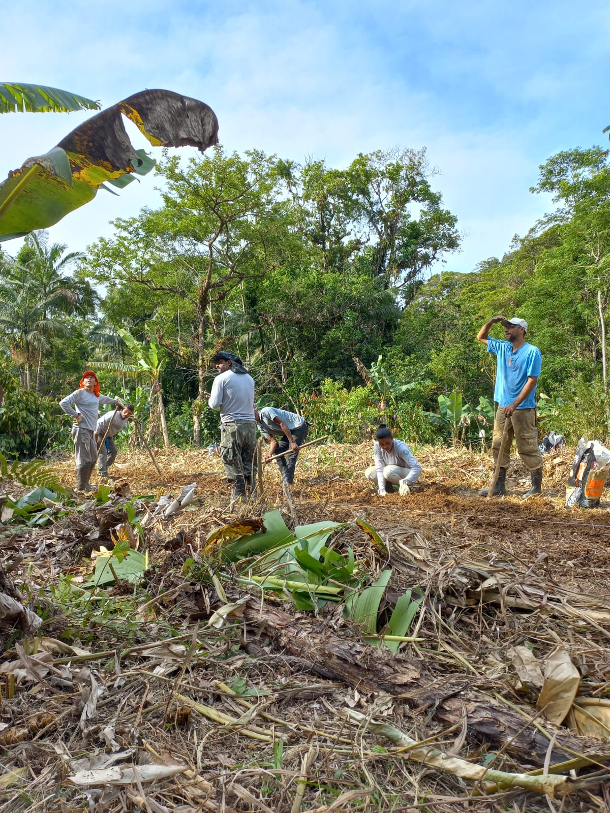 Equipe de campo em mutirão de implantação de sistema agroflorestal. Bairro Rio das Minas, Cananeia (SP)