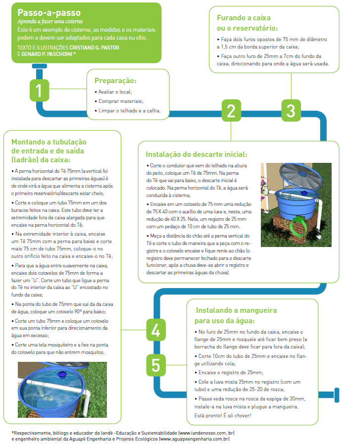 1 - Calcular o tamanho da cisterna considerando o telhado de onde a água vai ser recolhida e o espaço disponível para a cisterna. O telhado deve ter facilidade para ser limpo, evitando a contaminação da água. Também é bom considerar a quantidade média de chuvas. A cada 100 mm de chuva, caem 100 litros por metro quadrado. Por exemplo: em um lugar onde a chuva média é de 1.500 mm/ano, uma casa com 100 m² vai receber 150.000 litros por ano.
