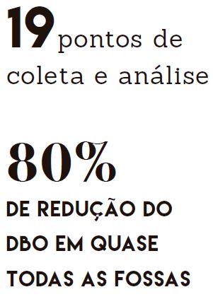 As fossas, por serem adaptações de tratamento de efluentes e, portanto, tecnologias novas, precisam de mais análises para que seja possível tirar conclusões sobre sua eficiência, isto é, o quanto estão tratando o esgoto. No entanto, com os resultados das três primeiras coletas já dá para atestar que o sistema está funcionando. A remoção de DBO, por exemplo, em quase todos os sistemas atinge 80%, que é o exigido pela legislacao (Decreto 8468/76) para um sistema de tratamento de esgoto. “Todas apresentaram melhora em relação à primeira análise. Algumas muito boas, outras boas”, conta Aline.