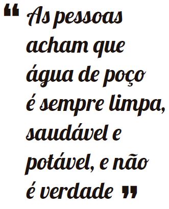 Ela lembra que o que vem do poço é resultado da infiltração da água no solo, e nesse processo ela pode carregar substâncias que estavam na superfície, como fertilizantes e agrotóxicos, e que podem contaminar essa água. E existem ainda os lugares em que as características naturais do solo elevam a concentracao de alguns elementos e tornam a água menos potável. Em alguns lugares, por exemplo, a água tem uma quantidade de alumínio mais de 10 vezes acima do normal, mas não tem nada a ver com ações do homem. Por isso, “é bom que a gente sempre saiba como é a água que estamos consumindo”, diz Aline.