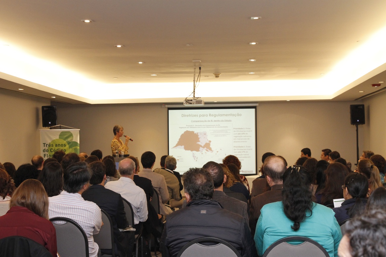 Na primeira mesa com a presença de representantes das Secretarias da Agricultura e do Meio Ambiente, foi possível acompanhar o atual estágio de implementação da lei e da adesão dos proprietários rurais a regulamentação pelo Cadastro Ambiental Rural (CAR) e da Lei Estadual 15.684/2015. Segundo Cristina Maria de Azevedo, Secretária-Adjunta do Meio Ambiente do Estado, mais de 67% das propriedades rurais de São Paulo já aderiram ao CAR. Na mesma linha otimista, se deu na apresentação do presidente da Sociedade Rural Brasileira, Gustavo Junqueira. O representante do setor produtivo afirmou que os produtores têm feito o que está a seu alcance, inclusive, desmatando menos e produzindo mais. Menos otimista foi o pronunciamento de Ricardo Rodrigues, professor da Escola Superior de Agricultura "Luiz de Queiroz" (ESALQ /USP) e especialista no tema. Para Rodrigues, poderia ter se avançado mais. Ele afirmou que São Paulo está atrás, por exemplo, do Pará onde a relação entre preservação ambiental e produção agrícola está melhor equacionada.