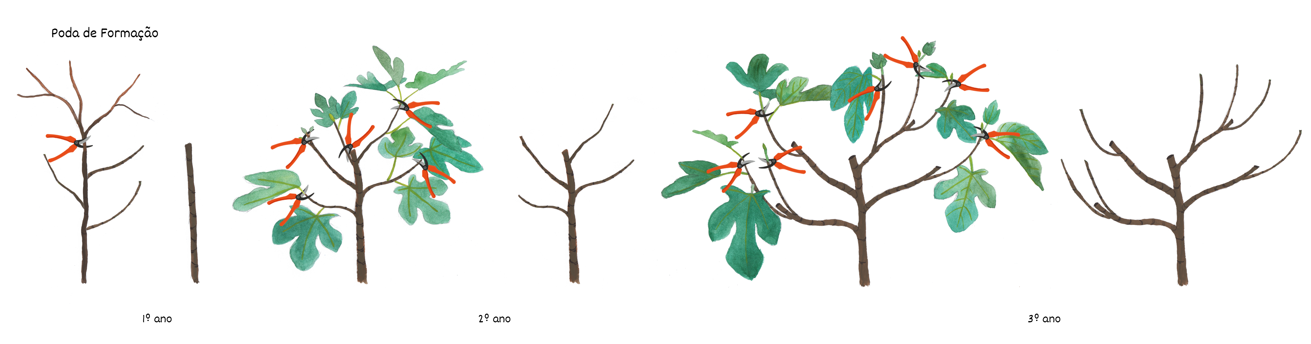 Serve para orientar o crescimento e fazer com que os ramos sejam bem distribuídos. No primeiro ano de plantio é feito um corte no caule central (ou apical) em uma altura que pode variar entre meio e um metro, dependendo da espécie e do lugar. Esta poda serve para favorecer o crescimento de galhos laterais. De preferência deve-se deixar quatro galhos, saindo de alturas diferentes e em direções opostas. Estes galhos quando atingirem comprimento de cerca de meio metro devem ser podados nas pontas para favorecer o crescimento dos galhos laterais. O ideal é que a planta fique com um formato de taça.