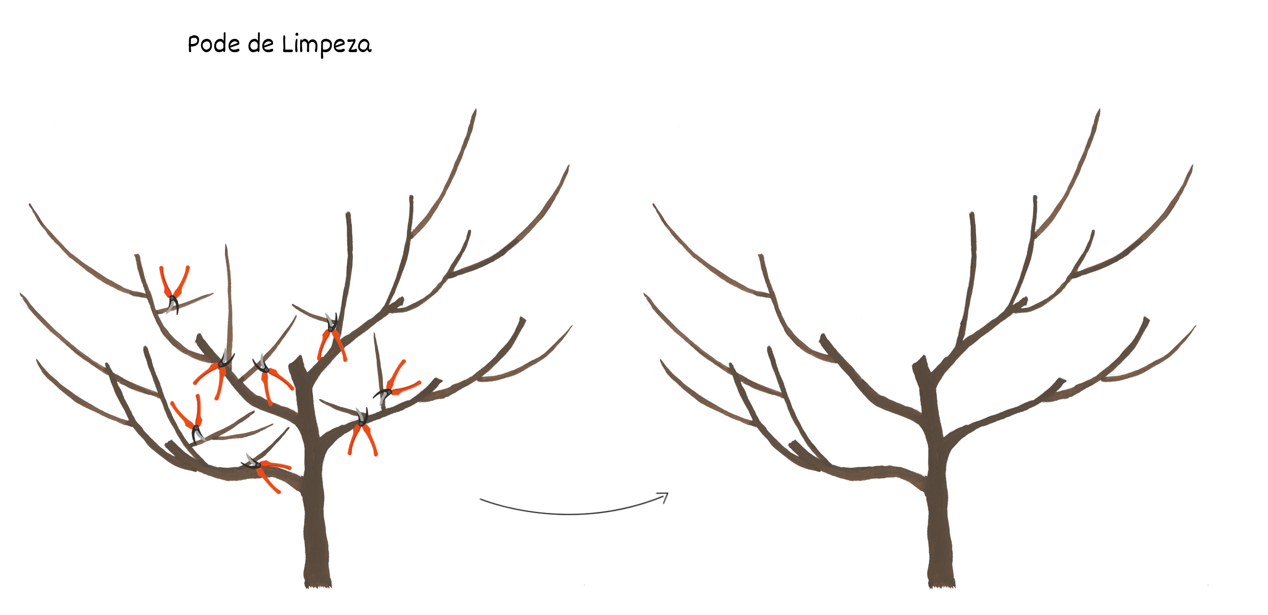 O objetivo é retirar galhos secos, os galhos “ladrões” (que apontam para cima, dificultando a distribuição de seivas para os galhos produtivos) e os que entram para dentro da “taça”, o que prejudica a iluminação e aeração da planta. Vale lembrar que quando falamos de frutíferas agroflorestais é provável que o sistema já possua uma luminosidade relativamente menor que pomares convencionais a pleno sol. Dessa forma, a poda de limpeza deve ser realizada com maior frequência.