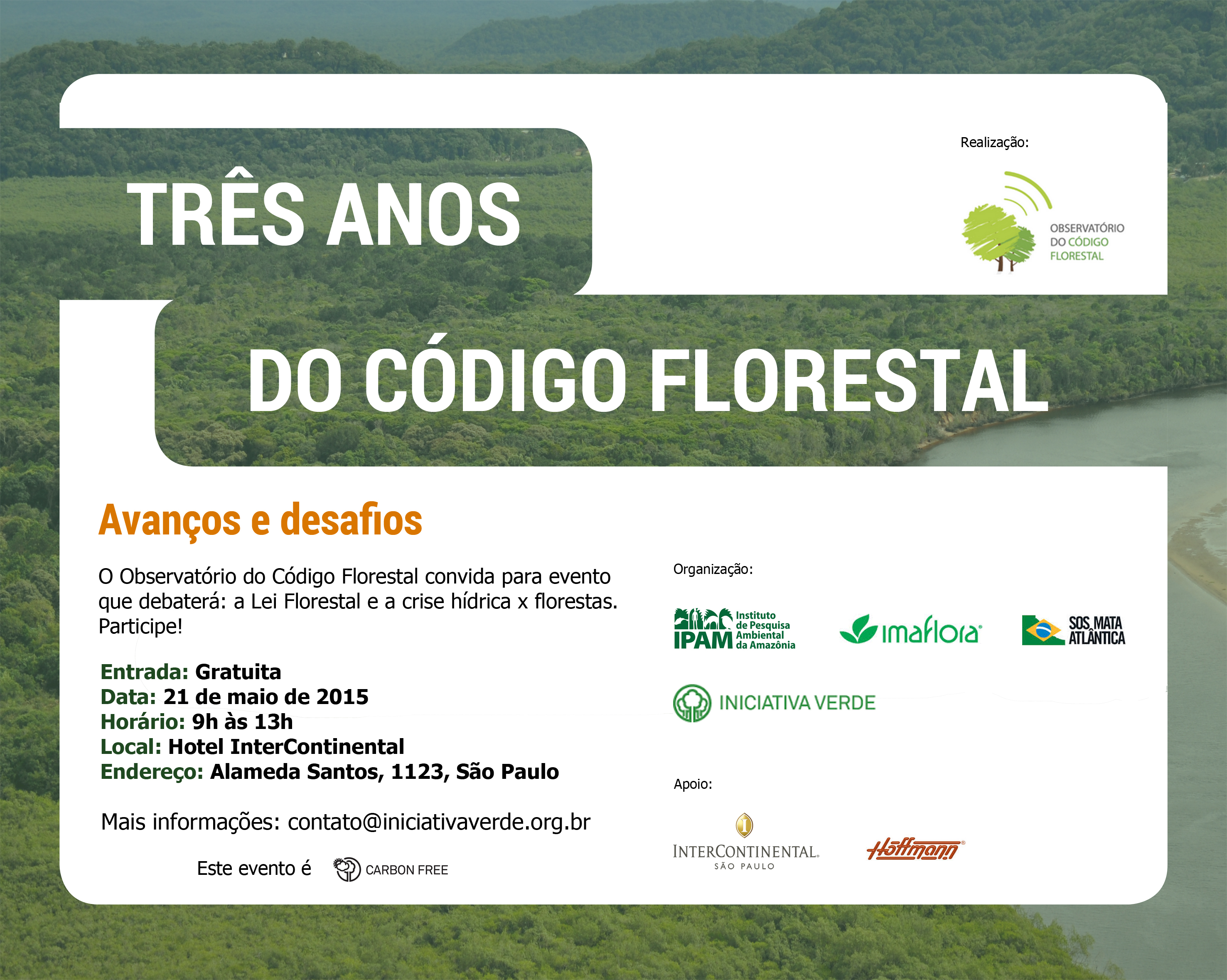 O encontro em São Paulo está sendo organizado pela Iniciativa Verde, IPAM, SOS Mata Atlântica e Imaflora e em simultaneidade com outros eventos realizados na mesma data pelo Observatório do Código Florestal (OCF) (http://www.observatorioflorestal.org.br). O Observatório é formado por instituições da sociedade civil e tem como objetivos monitorar a implementação da nova Lei Florestal (Lei Federal 12.651/2012) em todo o país.