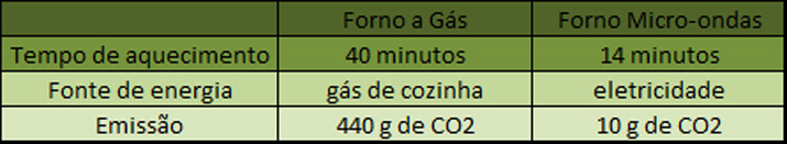 Para responder a esta pergunta, a Iniciativa Verde desenvolveu um pequeno estudo que compara as emissões de CO2 provenientes do aquecimento de uma lasanha de dois modos: no forno a gás e no forno micro-ondas. O quadro abaixo é um comparativo de algumas diferenças de cada opção de aquecimento.