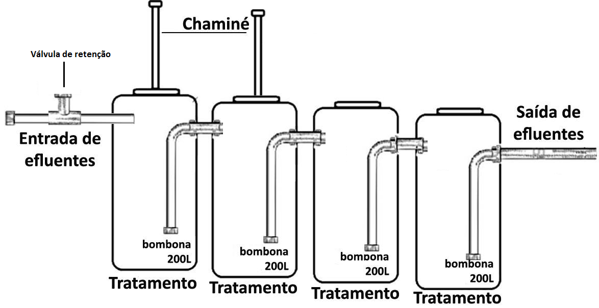 A Fossa Séptica Econômica é formada por um conjunto de, no mínimo, quatro bombonas de 200 litros conectadas por tubulações e conexões que promovem o tratamento do esgoto do vaso sanitário de uma residência com até cinco pessoas. A cada morador adicional acrescenta-se uma bombona até o máximo de sete bombonas.