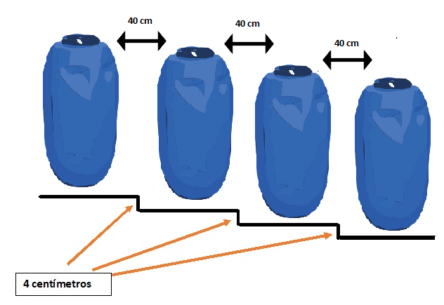 Feito isso, as bombonas podem ser colocadas no local, com a distância de 40 cm entre cada uma.