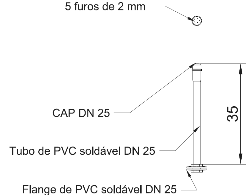 Depois de feitos os furos, para cada tampa deve ser conectado tubo de PVC soldável 25 mm com aproximadamente 35 cm de comprimento. A conexão é feita por meio de flange de PVC soldável de 25 mm.