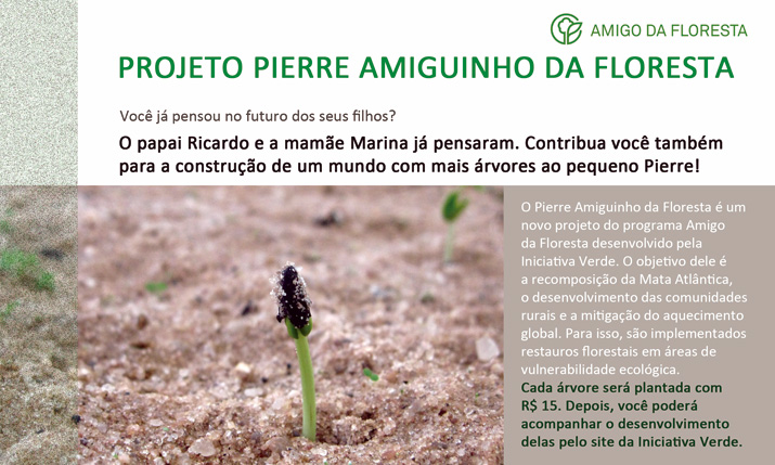O papai Ricardo e a mamãe Marina, preocupados com o ambiente onde viverá o seu primeiro filho, o Pierre, decidiram plantar um futuro mais seguro. Quem visitar o menino após o nascimento poderá colaborar com o plantio de árvores por meio do projeto Pierre Amiguinho da Floresta. Depois, os papais, os amigos que ajudaram a cultivar um planeta Terra mais saudável para se viver e o próprio Pierre poderão acompanhar o crescimento das árvores por meio do site da Iniciativa Verde.