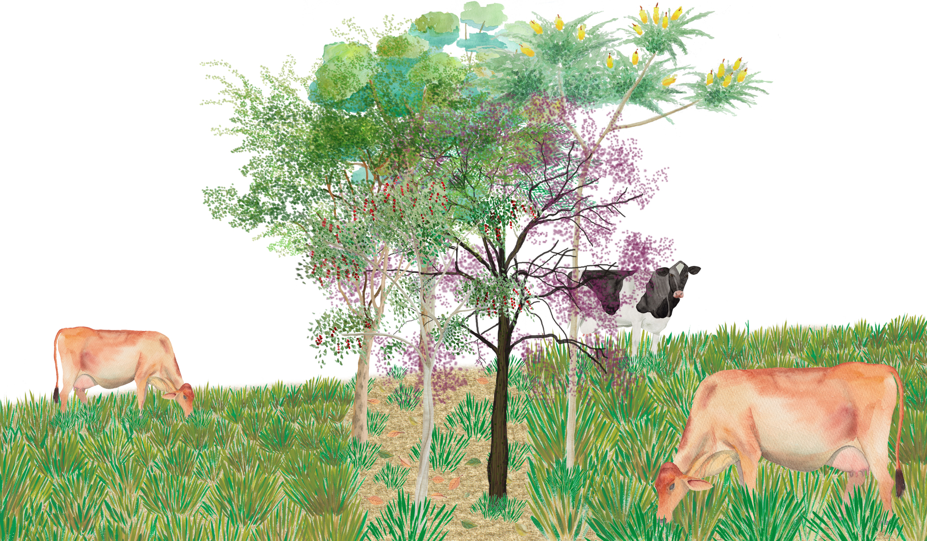 Também conhecido como sistema agrosilvipastoril, é um modelo que demora mais para ser implementado, pois o animal, se for de porte grande, só pode ser introduzido na área quando as árvores já tiverem crescido o suficiente para que suas copas sejam mais altas que os bichos. No plantio, as faixas de árvores permanentes devem ser mais largas, com 10 a 12 metros de distância entre cada faixa, pois as forrageiras, que são as plantas usadas para pastagem, necessitam de mais luz. O guandu entre as árvores pode ser deixado, da mesma maneira que no SAF com frutas. Ele tem um ciclo de vida mais curto, então quando as criações forem adicionadas, é provável que não esteja mais lá. E, se estiver, ele pode ser uma ótima fonte de proteína para os animais!