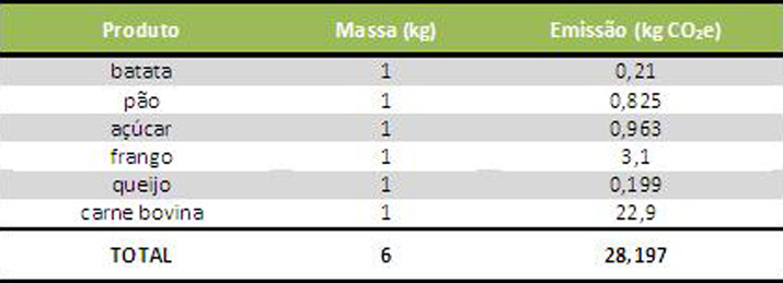 A terceira coluna calcula as emissões de gases de efeito estufa relativas ao processo produtivo de cada item. Para a produção de uma sacolinha de PEAD, as emissões são da ordem de 0,018 kg de CO2e. Resumindo, neste cenário as emissões do conteúdo da sacolinha são 1500 vezes maiores do que as emissões da fabricação da própria sacolinha.