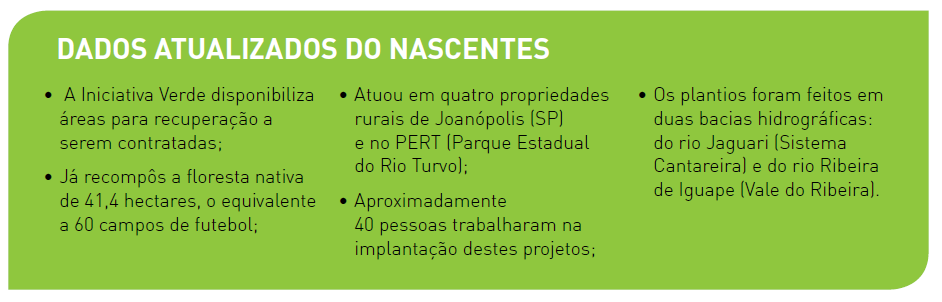 A Iniciativa Verde foi uma das primeiras organizações a propor projetos de recomposição florestal para o Programa Nascentes, do Governo do Estado de São Paulo, que tem como objetivo recuperar a vegetação combinando diversas ações por meio do financiamento por empresas que precisam cumprir Termos de Compromisso de Recuperação Ambiental (TCRAs). A novidade do Programa Nascentes é a possibilidade de agilizar o cumprimento de condicionantes do licenciamento ambiental. As obrigações de plantio de árvores podem ser alocadas em projetos previamente aprovados e localizados em áreas prioritárias, como regiões de mananciais e Unidades de Conservação. As empresas ganham tempo e a sociedade recebe mais benefícios na recuperação ambiental.