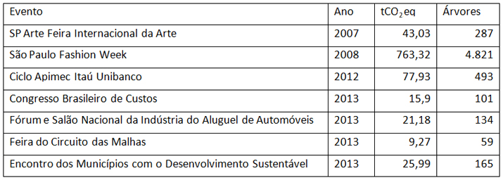 A tabela a seguir indica alguns exemplos de eventos ocorridos no Ibirapuera nos últimos anos, com suas respectivas emissões estimadas e a quantidade de árvores plantadas como compensação.