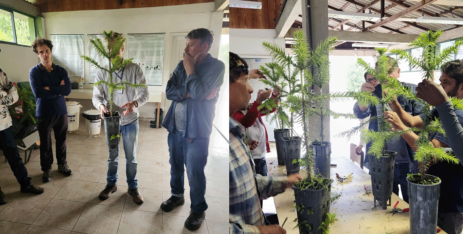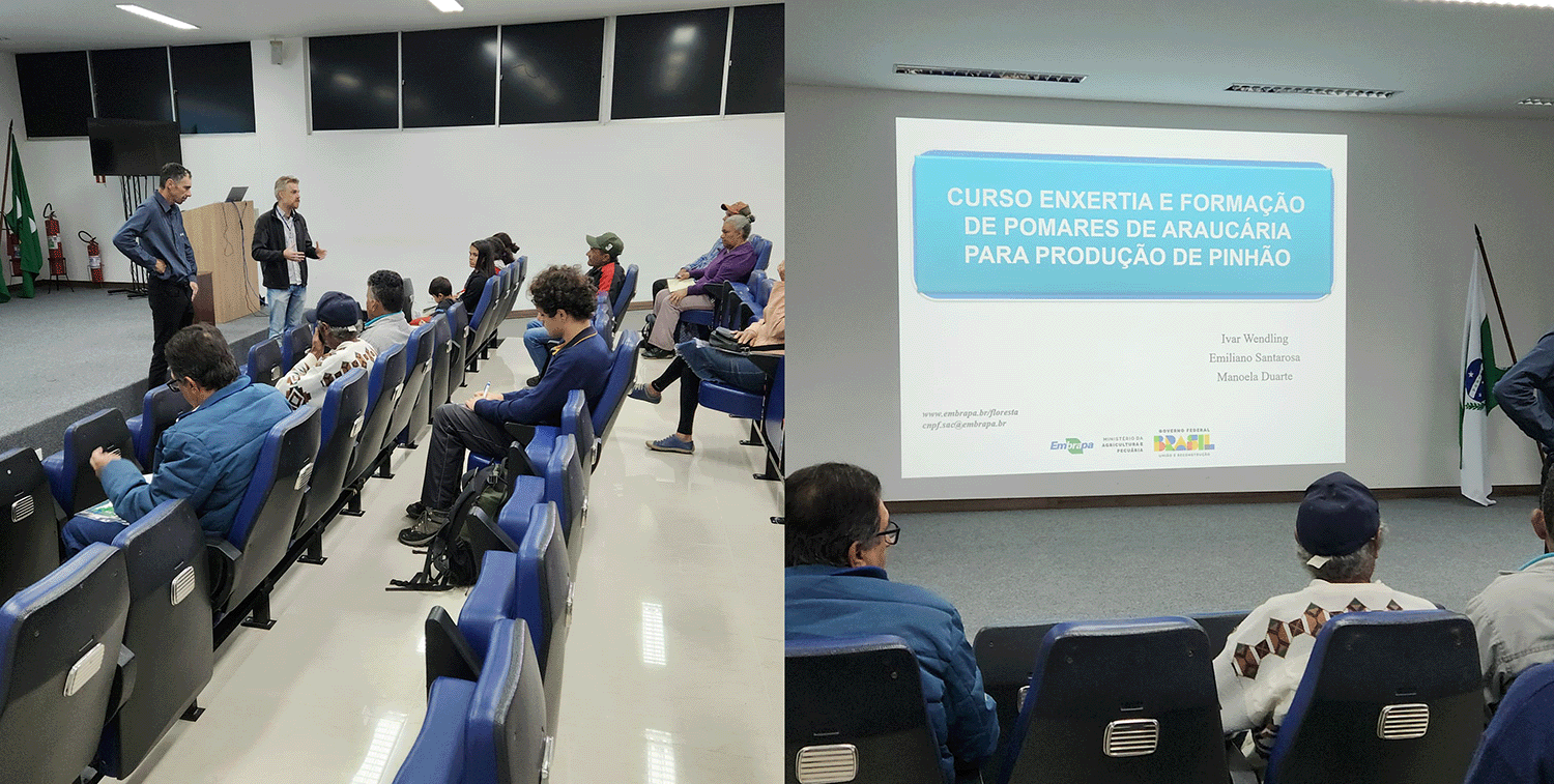 A Embrapa Florestas é referência nacional em pesquisa e desenvolvimento de tecnologias para o setor florestal. Seus especialistas compartilharam com os participantes os protocolos de enxertia desenvolvidos pela instituição, bem como conhecimentos sobre a formação e o manejo de pomares de araucária. A formação de pomares clonais, utilizando mudas enxertadas de matrizes selecionadas, não só garante uma produção mais rápida e uniforme, como também contribui para a conservação genética da espécie, ao permitir a multiplicação de indivíduos com características superiores. O curso foi ministrado por Ivar Wendling, pesquisador e engenheiro florestal e Emiliano Santarosa, engenheiro agrônomo e supervisor na área de transferência de tecnologia, ambos da Embrapa Florestas.